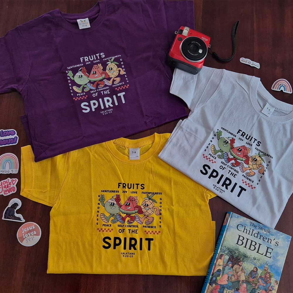 Let your little one wear a message that grows with them. Our Fruits of the Spirit tee features a fun, cartoon-style fruit illustration surrounded by the nine fruits of the Spirit – love, joy, peace, patience, kindness, goodness, faithfulness, gentleness, and self-control. Soft, breathable, and perfect for everyday play, this tee helps kids carry God’s Word wherever they go.