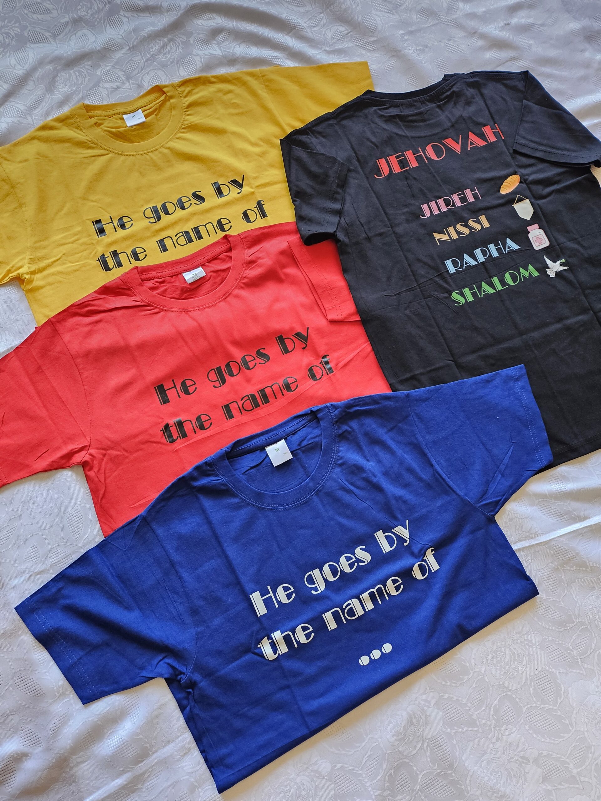 Our “He Goes by the Name of Jehovah” tee declares the power of God’s many names. The front reads “He goes by the name of”, while the back boldly features Jehovah Nissi, Rapha, Shalom, and Jireh. A meaningful design for anyone who wants to carry God’s identity with them.